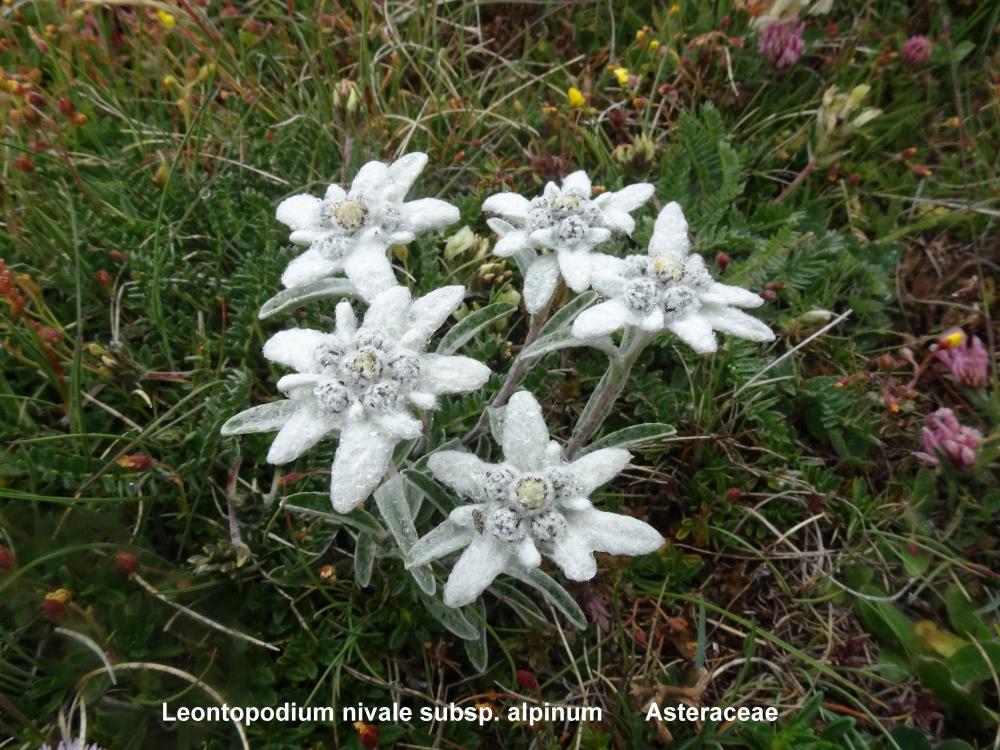 Arrivés au lac, nous rentrons par la route goudronnée. Elisabeth, à l’œil toujours aussi aguerri remarque une belle touffe de Leontopodium nivale. C’est une plante vivace très rustique aux feuilles longues et très étroites, gris vert, couvertes par un feutrage permetant à la plante de limiter la perte d’eau. Les parties blanches laineuses ne sont pas des pétales, mais des bractées entourées d’une substance blanche qui ressemble à du coton. Les fleurs jaunes sont rassemblées en plusieurs capitules serrés au centre de l’ensemble floral. Avec son capitule de capitules, l’Edelweiss est sur le plan botanique, une des formes les plus complexes d'inflorescence.