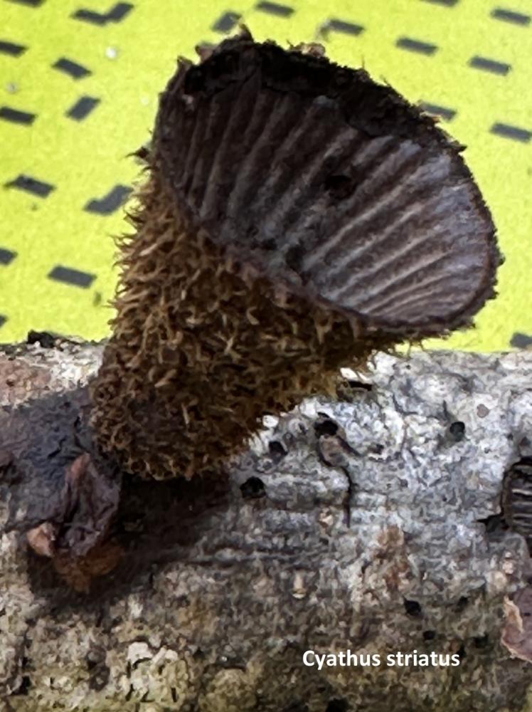 Les champignons n’étaient pas légion. Mais grâce aux yeux avertis de Brigitte et de Bertrand nos paniers se sont remplis de beaux spécimens totalement inconnus pour nous tel que le très curieux Cyathus striatus aux fructifications en forme de nid fermées par un opercule blanchâtre membraneux. Ce dernier se déchire à maturité et laisse apparaitre les spores ressemblant à des petits œufs.