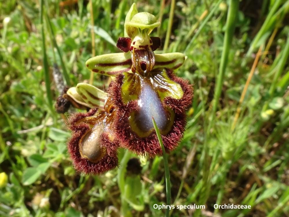 Premières herborisations sur une prairie aux alentours du Couvent Saint Salvador de la Horta de San Juan. Nous y découvrons Ophrys speculum, Mercurialis tomentosa...