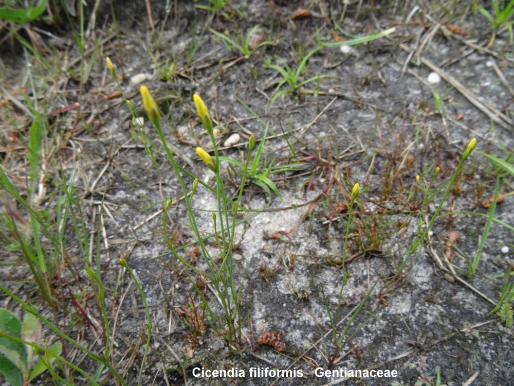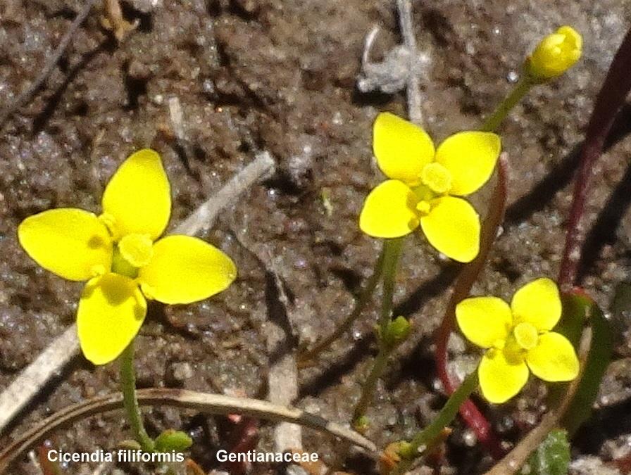 Nous avons été très surpris de découvrir, pour la première fois sur ce site, deux magnifiques stations d’une minuscule gentianacée : la Cicendia filiformis ; petite plante à éclipses, pouvant former des populations assez importantes et disparaître soudainement sans raison apparente, puis réapparaître sans plus de raison, à partir de la banque de semences du sol. Victime de la disparition ou la dégradation des milieux humides, elle est en régression dans toute la France. Elle semble avoir déjà pratiquement disparu de nombreuses régions (Dauphiné, Ile-de-France...) et reste très vulnérable ailleurs.