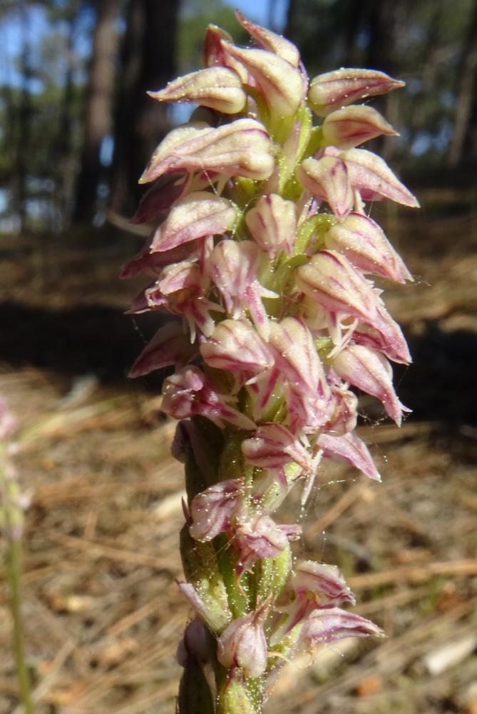 Sortie décevante au Porge ce jeudi 7 avril. La pluie qui nous a tant manqué cet hiver était au rendez-vous. Une accalmie nous a permis d’herboriser au sec dans les dunes. Les floraisons brillaient par leur rareté en raison de la sécheresse. Les sangliers nous avaient devancés, labourant consciencieusement le terrain. Les rares Neotinea maculata trouvées n’étaient pas fleuries. Il en était de même au Pouch où les Daphné cneorum ne nous ont offert que leurs boutons.