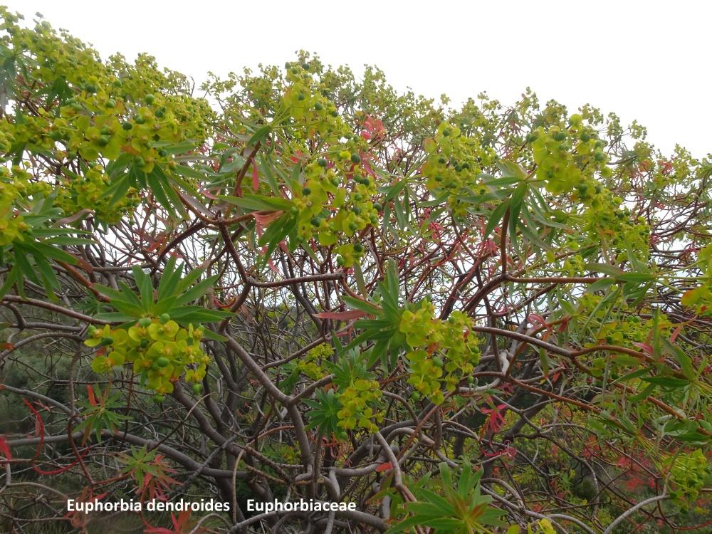 Notre matinée se termine au milieu des Euphorbia dendroides, arbrisseau de forme sphérique, très ramifié, pouvant atteindre 2 mètres de circonférence. A la fin du printemps, le buisson devient rouge puis perd toutes ses feuilles et prend un aspect très différent : on ne voit plus que les rameaux ligneux, plusieurs fois bifurqués et de couleur rougeâtre, principalement pour les pousses de l'année.